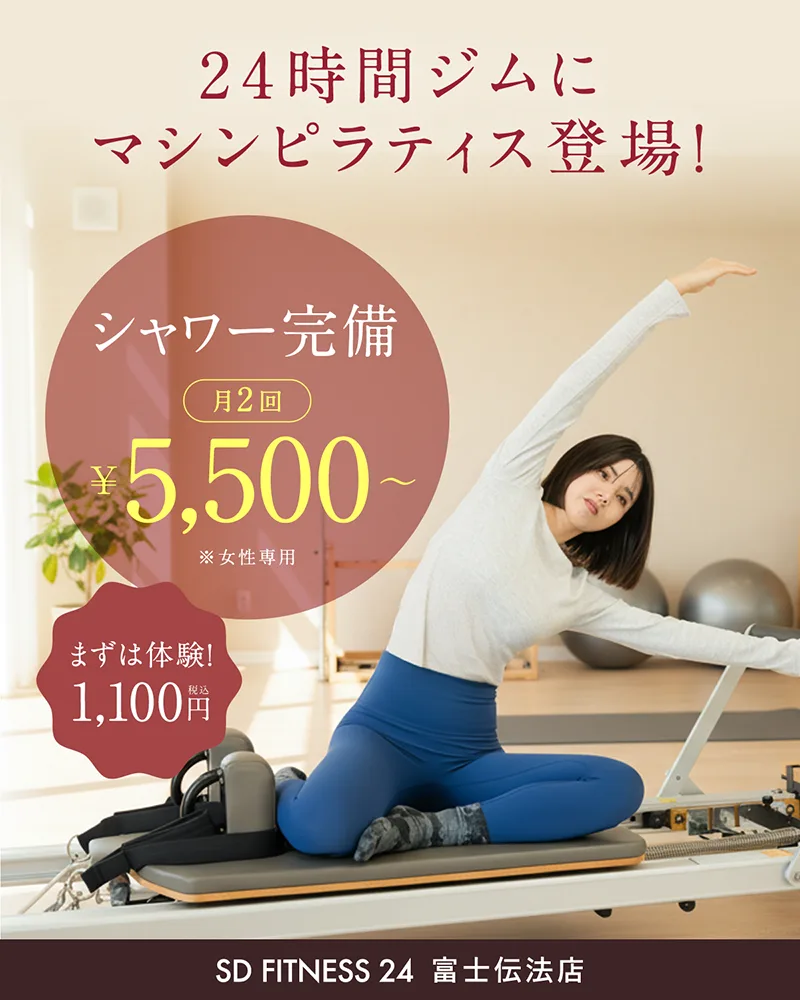 富士市のフィットネスジムならSDフィットネス24富士伝法店 安心・安全な環境づくり新型コロナ感染症対策について 館内でのマスク着用を任意といたします。 スタッフにつきましては当面の間はマスクを着用させていただきます。 マスクの非着用時、至近距離や大声での会話はお控えください。 体調が優れない場合はご利用をお控えください。 手洗いや手指の消毒等、引き続きご協力をお願いいたします。 新着情報 2026年1月19日 NEW! 会員システム変更に伴う「会費支払い方法」変更のお知らせ 2025年12月15日 年末年始営業のお知らせ 2025年7月16日 お盆営業のお知らせ 一覧をみる 充実の設備やメニュー 初心者サポート マシントレーニング スタジオプログラム マシンピラティス パーソナルトレーニング VRC加圧トレーニング 水素水 シャワールーム 店舗の特徴はこちら お客様の声 コツコツ1年半で目標のマイナス13Kg達成! 1日何回でも受けられるコースで、それもメリット。時間が空いたら、バイクをこいでみたり、ほかの人と一緒にストレッチをしたりで、昼も夜も行っています。 ホットヨガは「人と比べずに、この時間だけは自分に集中して」という先生の声かけもあって、自分のために時間を使っていることを意識しています。行くと心もスッキリする感覚があります。 自分の体ってこんなに変わるんだ!? パーソナルトレーニングで人生初めての経験! コロナ禍でなかなか運動ができなかったときに、パーソナルトレーニングを受けてみようと思い、始めたのが1年前の夏でした。パーソナルトレーニングで教えてもらったことを、ヨガや、ジムのマシンやウエイトを使って実践しています。 高校時代から運動をしてきたのでマシンも一通り使い方は分かっていたし、マラソンなどもやってきましたが、パーソナルトレーニングを受けて、自分の体ってこんなに変わるんだと思ったのは人生初め 好きな時間に自由に通える週3日のトレーニングが自分にピッタリ! Tシャツをカッコよく着たい!というのが通い始めた一番の理由でした。 週3回通うくらいだとがっつり「筋肉!」という感じではないものの、1年4か月で体が引き締まりました。肩周りや胸など、最近周囲から「ガタイが良くなったね」と言われるので、目指すところにはなっているかなと感じています。 18kgの減量に成功!トレーニングをしてお風呂に入って帰宅することが1日のルーティンに! やせたい目的でSTARFITに通って運動を始めましたが、体の動かし方やトレーニングの意味も教えてもらってやってみたら1年で10kgやせて、そこで停滞期もありましたが、食事のアドバイスを実践してまた8kgやせることができました。 ※店舗によって提供しているサービスが異なります※本事例は一例であり、成果を保証するものではありません お客様の声をもっと見る Google口コミ Googleに寄せられた実際のご利用者様の声です。 フリーウェイ環境が抜群に良いです マシン類のレイアウトも使いやすい印象 筋トレし易いジムです 素敵なスタッフさんも多数いましたし顔認証なの会員カード的なものをなくす心配も無いです 引用:Googleマップ 本格的なスポーツジム設備にマシンピラティスの設備もリニューアルされていて、綺麗な室内で広々と運動ができる。スタジオも広く、きちんと面積が確保されているため周りを気にせず運動できる。 引用:Googleマップ 水素水が無料で飲めて嬉しいです。体重が減ったので嬉しいです。室内は涼しいので日中に来ることをおすすめします。 引用:Googleマップ もっと見る バリエーション豊かな設備・スペース ジムスペース トレッドミル、エアロバイクなどの有酸素運動マシンが豊富な『カーディオエリア』 脚、上腕など鍛えたい部位を集中的にトレーニングする『マシンエリア』 胸の中央部を鍛えられるケーブルクロス、三頭筋を鍛えられるプッシュダウン、広背筋を鍛えられるプルダウンとローロー配置する『ケーブルマシンエリア』 がございます。 シャワールーム 男女ともシャワールームを完備。運動後に汗を洗い流して、気持ち良くお帰り頂けます。 充実の スタジオプログラム 定番のダンスや格闘技系エクササイズ、ゆったりと心身のバランスを整えるヒーリング系プログラム、話題のレッスンやイベントプログラムなど幅広く用意しています。 共有スペース パウダールームでは、トレーニング後、シャワーを浴びた後にゆったりとお支度をしていただけます。 清潔かつ機能的なロッカールームもご用意しており、荷物の多い仕事帰りに通うことも前提に、大型のロッカーを配置しています。 ジムスペース トレッドミル、エアロバイクなどの有酸素運動マシンが豊富な『カーディオエリア』 脚、上腕など鍛えたい部位を集中的にトレーニングする『マシンエリア』 胸の中央部を鍛えられるケーブルクロス、三頭筋を鍛えられるプッシュダウン、広背筋を鍛えられるプルダウンとローロー配置する『ケーブルマシンエリア』 がございま