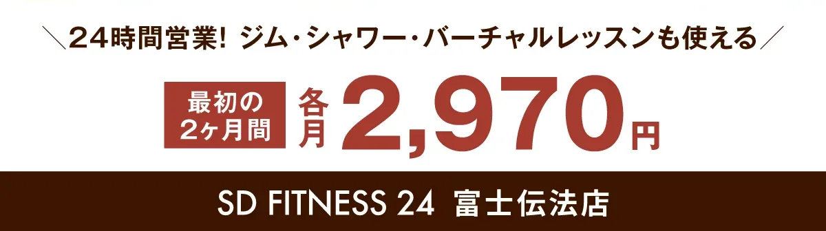 富士市のフィットネスジムならSDフィットネス24富士伝法店 安心・安全な環境づくり新型コロナ感染症対策について 館内でのマスク着用を任意といたします。 スタッフにつきましては当面の間はマスクを着用させていただきます。 マスクの非着用時、至近距離や大声での会話はお控えください。 体調が優れない場合はご利用をお控えください。 手洗いや手指の消毒等、引き続きご協力をお願いいたします。 新着情報 2026年1月19日 会員システム変更に伴う「会費支払い方法」変更のお知らせ 2025年12月15日 年末年始営業のお知らせ 2025年7月16日 お盆営業のお知らせ 一覧をみる 充実の設備やメニュー 初心者サポート マシントレーニング スタジオプログラム マシンピラティス パーソナルトレーニング VRC加圧トレーニング 水素水 シャワールーム 店舗の特徴はこちら お客様の声 コツコツ1年半で目標のマイナス13Kg達成! 1日何回でも受けられるコースで、それもメリット。時間が空いたら、バイクをこいでみたり、ほかの人と一緒にストレッチをしたりで、昼も夜も行っています。 ホットヨガは「人と比べずに、この時間だけは自分に集中して」という先生の声かけもあって、自分のために時間を使っていることを意識しています。行くと心もスッキリする感覚があります。 自分の体ってこんなに変わるんだ!? パーソナルトレーニングで人生初めての経験! コロナ禍でなかなか運動ができなかったときに、パーソナルトレーニングを受けてみようと思い、始めたのが1年前の夏でした。パーソナルトレーニングで教えてもらったことを、ヨガや、ジムのマシンやウエイトを使って実践しています。 高校時代から運動をしてきたのでマシンも一通り使い方は分かっていたし、マラソンなどもやってきましたが、パーソナルトレーニングを受けて、自分の体ってこんなに変わるんだと思ったのは人生初め 好きな時間に自由に通える週3日のトレーニングが自分にピッタリ! Tシャツをカッコよく着たい!というのが通い始めた一番の理由でした。 週3回通うくらいだとがっつり「筋肉!」という感じではないものの、1年4か月で体が引き締まりました。肩周りや胸など、最近周囲から「ガタイが良くなったね」と言われるので、目指すところにはなっているかなと感じています。 18kgの減量に成功!トレーニングをしてお風呂に入って帰宅することが1日のルーティンに! やせたい目的でSTARFITに通って運動を始めましたが、体の動かし方やトレーニングの意味も教えてもらってやってみたら1年で10kgやせて、そこで停滞期もありましたが、食事のアドバイスを実践してまた8kgやせることができました。 ※店舗によって提供しているサービスが異なります※本事例は一例であり、成果を保証するものではありません お客様の声をもっと見る Google口コミ Googleに寄せられた実際のご利用者様の声です。 フリーウェイ環境が抜群に良いです マシン類のレイアウトも使いやすい印象 筋トレし易いジムです 素敵なスタッフさんも多数いましたし顔認証なの会員カード的なものをなくす心配も無いです 引用:Googleマップ 本格的なスポーツジム設備にマシンピラティスの設備もリニューアルされていて、綺麗な室内で広々と運動ができる。スタジオも広く、きちんと面積が確保されているため周りを気にせず運動できる。 引用:Googleマップ 水素水が無料で飲めて嬉しいです。体重が減ったので嬉しいです。室内は涼しいので日中に来ることをおすすめします。 引用:Googleマップ もっと見る バリエーション豊かな設備・スペース ジムスペース トレッドミル、エアロバイクなどの有酸素運動マシンが豊富な『カーディオエリア』 脚、上腕など鍛えたい部位を集中的にトレーニングする『マシンエリア』 胸の中央部を鍛えられるケーブルクロス、三頭筋を鍛えられるプッシュダウン、広背筋を鍛えられるプルダウンとローロー配置する『ケーブルマシンエリア』 がございます。 シャワールーム 男女ともシャワールームを完備。運動後に汗を洗い流して、気持ち良くお帰り頂けます。 充実の スタジオプログラム 定番のダンスや格闘技系エクササイズ、ゆったりと心身のバランスを整えるヒーリング系プログラム、話題のレッスンやイベントプログラムなど幅広く用意しています。 共有スペース パウダールームでは、トレーニング後、シャワーを浴びた後にゆったりとお支度をしていただけます。 清潔かつ機能的なロッカールームもご用意しており、荷物の多い仕事帰りに通うことも前提に、大型のロッカーを配置しています。 ジムスペース トレッドミル、エアロバイクなどの有酸素運動マシンが豊富な『カーディオエリア』 脚、上腕など鍛えたい部位を集中的にトレーニングする『マシンエリア』 胸の中央部を鍛えられるケーブルクロス、三頭筋を鍛えられるプッシュダウン、広背筋を鍛えられるプルダウンとローロー配置する『ケーブルマシンエリア』 がございます。 