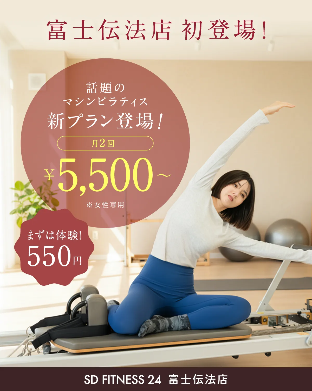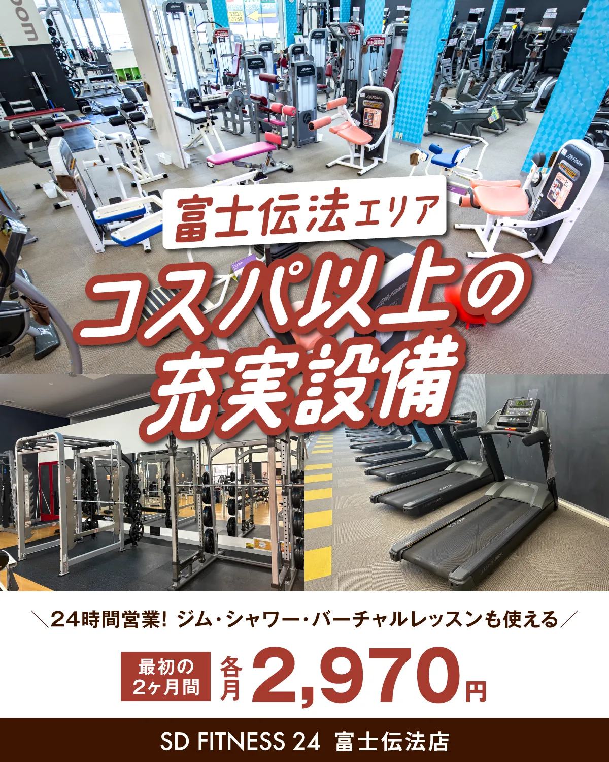 富士市のフィットネスジムならSDフィットネス24富士伝法店 安心・安全な環境づくり新型コロナ感染症対策について 館内でのマスク着用を任意といたします。 スタッフにつきましては当面の間はマスクを着用させていただきます。 マスクの非着用時、至近距離や大声での会話はお控えください。 体調が優れない場合はご利用をお控えください。 手洗いや手指の消毒等、引き続きご協力をお願いいたします。 新着情報 2025年7月16日 お盆営業のお知らせ 2025年7月2日 大好評!水素水が月会費内で飲み放題! 2025年7月1日 マシンピラティス【7/31まで】夏の入会キャンペーン 一覧をみる 充実の設備やメニュー 初心者サポート マシントレーニング スタジオプログラム マシンピラティス パーソナルトレーニング VRC加圧トレーニング 水素水 シャワールーム 店舗の特徴はこちら お客様の声 コツコツ1年半で目標のマイナス13Kg達成! 1日何回でも受けられるコースで、それもメリット。時間が空いたら、バイクをこいでみたり、ほかの人と一緒にストレッチをしたりで、昼も夜も行っています。 ホットヨガは「人と比べずに、この時間だけは自分に集中して」という先生の声かけもあって、自分のために時間を使っていることを意識しています。行くと心もスッキリする感覚があります。 自分の体ってこんなに変わるんだ!? パーソナルトレーニングで人生初めての経験! コロナ禍でなかなか運動ができなかったときに、パーソナルトレーニングを受けてみようと思い、始めたのが1年前の夏でした。パーソナルトレーニングで教えてもらったことを、ヨガや、ジムのマシンやウエイトを使って実践しています。 高校時代から運動をしてきたのでマシンも一通り使い方は分かっていたし、マラソンなどもやってきましたが、パーソナルトレーニングを受けて、自分の体ってこんなに変わるんだと思ったのは人生初め 好きな時間に自由に通える週3日のトレーニングが自分にピッタリ! Tシャツをカッコよく着たい!というのが通い始めた一番の理由でした。 週3回通うくらいだとがっつり「筋肉!」という感じではないものの、1年4か月で体が引き締まりました。肩周りや胸など、最近周囲から「ガタイが良くなったね」と言われるので、目指すところにはなっているかなと感じています。 18kgの減量に成功!トレーニングをしてお風呂に入って帰宅することが1日のルーティンに! やせたい目的でSTARFITに通って運動を始めましたが、体の動かし方やトレーニングの意味も教えてもらってやってみたら1年で10kgやせて、そこで停滞期もありましたが、食事のアドバイスを実践してまた8kgやせることができました。 ※店舗によって提供しているサービスが異なります※本事例は一例であり、成果を保証するものではありません お客様の声をもっと見る Google口コミ Googleに寄せられた実際のご利用者様の声です。 フリーウェイ環境が抜群に良いです マシン類のレイアウトも使いやすい印象 筋トレし易いジムです 素敵なスタッフさんも多数いましたし顔認証なの会員カード的なものをなくす心配も無いです 引用:Googleマップ 本格的なスポーツジム設備にマシンピラティスの設備もリニューアルされていて、綺麗な室内で広々と運動ができる。スタジオも広く、きちんと面積が確保されているため周りを気にせず運動できる。 引用:Googleマップ 水素水が無料で飲めて嬉しいです。体重が減ったので嬉しいです。室内は涼しいので日中に来ることをおすすめします。 引用:Googleマップ もっと見る バリエーション豊かな設備・スペース ジムスペース トレッドミル、エアロバイクなどの有酸素運動マシンが豊富な『カーディオエリア』 脚、上腕など鍛えたい部位を集中的にトレーニングする『マシンエリア』 胸の中央部を鍛えられるケーブルクロス、三頭筋を鍛えられるプッシュダウン、広背筋を鍛えられるプルダウンとローロー配置する『ケーブルマシンエリア』 がございます。 シャワールーム 男女ともシャワールームを完備。運動後に汗を洗い流して、気持ち良くお帰り頂けます。 充実の スタジオプログラム 定番のダンスや格闘技系エクササイズ、ゆったりと心身のバランスを整えるヒーリング系プログラム、話題のレッスンやイベントプログラムなど幅広く用意しています。 共有スペース パウダールームでは、トレーニング後、シャワーを浴びた後にゆったりとお支度をしていただけます。 清潔かつ機能的なロッカールームもご用意しており、荷物の多い仕事帰りに通うことも前提に、大型のロッカーを配置しています。 ジムスペース トレッドミル、エアロバイクなどの有酸素運動マシンが豊富な『カーディオエリア』 脚、上腕など鍛えたい部位を集中的にトレーニングする『マシンエリア』 胸の中央部を鍛えられるケーブルクロス、三頭筋を鍛えられるプッシュダウン、広背筋を鍛えられるプルダウンとローロー配置する『ケーブルマシンエリア』 がございます