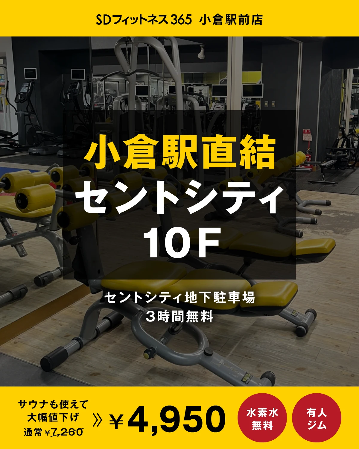 北九州市小倉のフィットネスジムならSDフィットネス365小倉駅前店 安心・安全な環境づくり新型コロナ感染症対策について 館内でのマスク着用を任意といたします。 スタッフにつきましては当面の間はマスクを着用させていただきます。 マスクの非着用時、至近距離や大声での会話はお控えください。 体調が優れない場合はご利用をお控えください。 手洗いや手指の消毒等、引き続きご協力をお願いいたします。 新着情報 2026年3月23日 NEW! レッスン同時予約数「追加オプション」の販売開始について 2026年3月12日 【重要】予約システム運用ルール変更日の延期と運用詳細について 2026年3月1日 予約システム運用ルールの一部変更のお知らせ 一覧をみる 充実の設備やメニュー 初心者サポート マシントレーニング スタジオプログラム パーソナルトレーニング VRC加圧トレーニング 水素水 セルフエステ 充実のスパ 店舗の特徴はこちら お客様の声 コツコツ1年半で目標のマイナス13Kg達成! 1日何回でも受けられるコースで、それもメリット。時間が空いたら、バイクをこいでみたり、ほかの人と一緒にストレッチをしたりで、昼も夜も行っています。 ホットヨガは「人と比べずに、この時間だけは自分に集中して」という先生の声かけもあって、自分のために時間を使っていることを意識しています。行くと心もスッキリする感覚があります。 自分の体ってこんなに変わるんだ!? パーソナルトレーニングで人生初めての経験! コロナ禍でなかなか運動ができなかったときに、パーソナルトレーニングを受けてみようと思い、始めたのが1年前の夏でした。パーソナルトレーニングで教えてもらったことを、ヨガや、ジムのマシンやウエイトを使って実践しています。 高校時代から運動をしてきたのでマシンも一通り使い方は分かっていたし、マラソンなどもやってきましたが、パーソナルトレーニングを受けて、自分の体ってこんなに変わるんだと思ったのは人生初め 好きな時間に自由に通える週3日のトレーニングが自分にピッタリ! Tシャツをカッコよく着たい!というのが通い始めた一番の理由でした。 週3回通うくらいだとがっつり「筋肉!」という感じではないものの、1年4か月で体が引き締まりました。肩周りや胸など、最近周囲から「ガタイが良くなったね」と言われるので、目指すところにはなっているかなと感じています。 18kgの減量に成功!トレーニングをしてお風呂に入って帰宅することが1日のルーティンに! やせたい目的でSTARFITに通って運動を始めましたが、体の動かし方やトレーニングの意味も教えてもらってやってみたら1年で10kgやせて、そこで停滞期もありましたが、食事のアドバイスを実践してまた8kgやせることができました。 ※店舗によって提供しているサービスが異なります※本事例は一例であり、成果を保証するものではありません お客様の声をもっと見る Google口コミ Googleに寄せられた実際のご利用者様の声です。 パーソナルトレーニングで通い始めました。トレーナーの安部さんに付いていただいていますが、まずは筋肉や骨の位置を正常に戻すため整体していただいてからというもの、体調がめちゃくちゃ良いです!疲れにくくなったし、毎日の生活のパフォーマンスがとても上がりました。これからが続けていくのが楽しみです♪ 引用:Googleマップ もっと見る バリエーション豊かな設備・スペース ジムスペース ランニングマシン(トレッドミル)、エアロバイクなど有酸素運動マシンを豊富に取り揃えている『有酸素運動エリア』 バーベルやダンベルによるウエイトトレーニングができる『フリーウェイトエリア』 脚、上腕など鍛えたい部位を集中的にトレーニングする『マシンエリア』がございます。 ランニングマシンはインターネットにつながっているので、動画を見ながらお楽しみいただけます。 シャワー 男女ともシャワールームを完備。運動後に汗を洗い流して、気持ちよくお帰り頂けます。 充実の スタジオプログラム 定番のダンスや格闘技系エクササイズ、ゆったりと心身のバランスを整えるヒーリング系プログラム、話題のレッスンやイベントプログラムなど幅広く用意しています。 共有スペース ラウンジでは、休憩やメンバーとのコミュニケーションの場としてご自由にお使いいただけます。 パウダールームでは、トレーニング後、入浴後にゆったりとお支度をしていただけます。ドライヤーなど、女性に必要なアメニティグッズも取り揃えており、荷物の多い仕事帰りに通うことも想定した、清潔かつ機能的なロッカールームもご用意しています。 ジムスペース ランニングマシン(トレッドミル)、エアロバイクなど有酸素運動マシンを豊富に取り揃えている『有酸素運動エリア』 バーベルやダンベルによるウエイトトレーニングができる『フリーウェイトエリア』 脚、上腕など鍛えたい部位を集中的にトレーニングする『マシンエリア』がございます。 ランニングマシンはイン