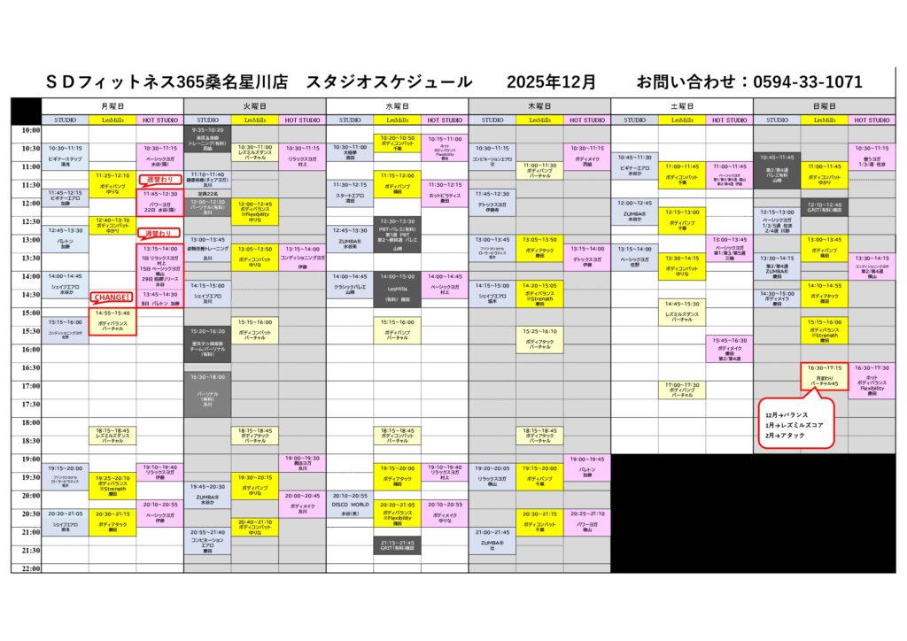 12月スタジオスケジュールのご案内 公開済み: 2025年11月12日更新: 2025年11月12日作成者: スタッフカテゴリー: 新着情報 【2025年12月スタジオスケジュール】 いつも桑名星川店をご利用いただきありがとうございます。 12月のスタジオスケジュールとなります。 みなさまのご参加お待ちしております😄 前の記事 8月スタジオスケジュールのご案内 関連記事 2023/11/23 年末年始営業について 2024/08/31 台風10号接近にう伴う営業について 2024/08/30 台風10号接近に伴う営業について 2024/10/31 【11月23日 祝日プログラムお知らせ】