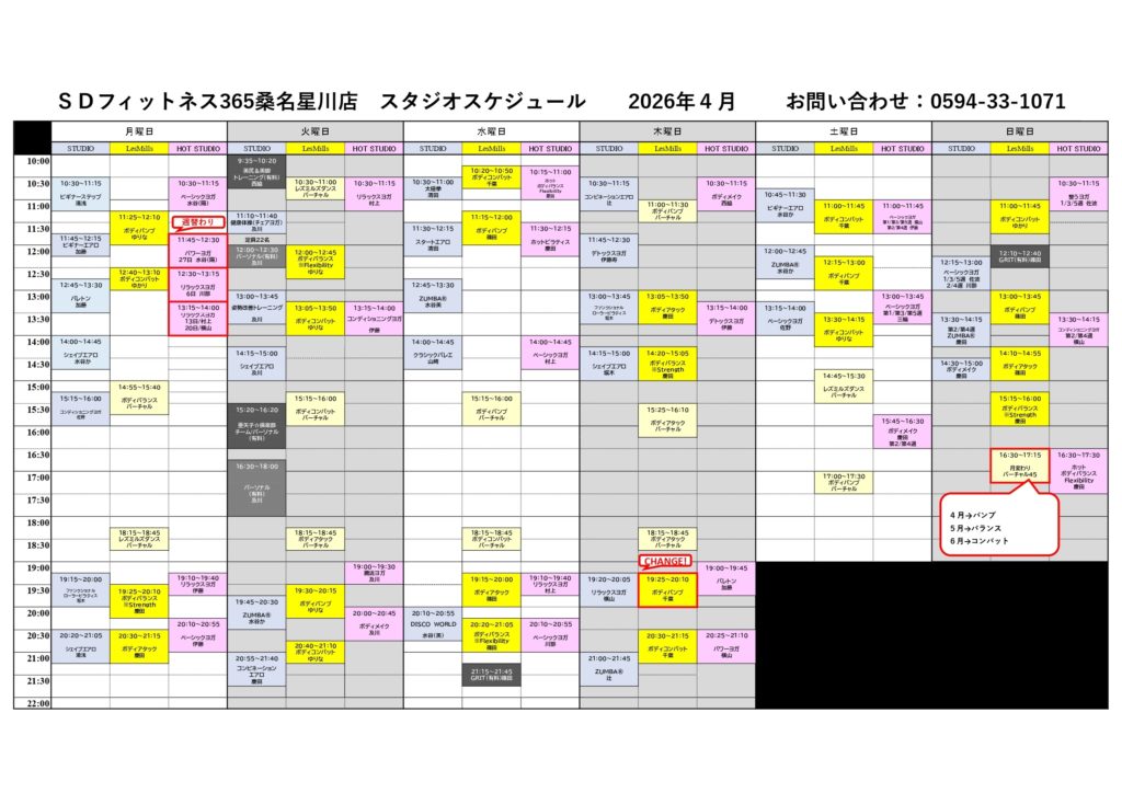 4月スタジオスケジュールのご案内 公開済み: 2026年3月22日更新: 2026年3月22日作成者: スタッフカテゴリー: 新着情報 【2026年4月スタジオスケジュール】 いつも桑名星川店をご利用いただきありがとうございます。 4月のスタジオスケジュールとなります。 みなさまのご参加お待ちしております 前の記事 3月スタジオスケジュールのご案内 関連記事 2024/08/31 台風10号接近にう伴う営業について 2024/10/31 【11月23日 祝日プログラムお知らせ】 2023/11/28 バーチャルレッスン参加対象者変更のお知らせ 2025/11/12 12月スタジオスケジュールのご案内