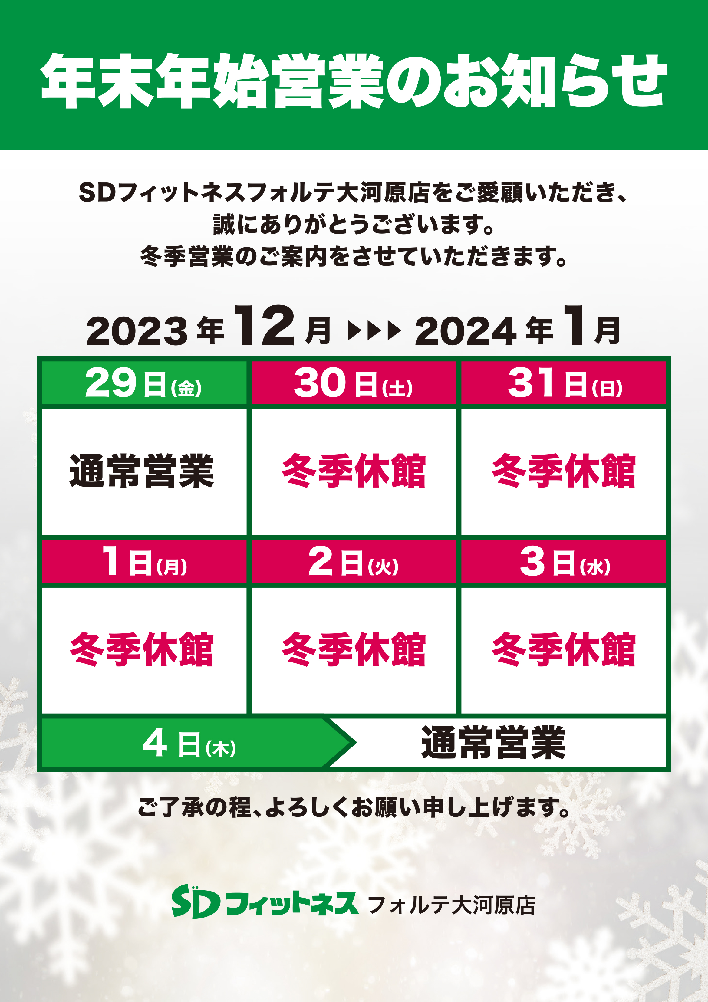 年末年始営業について 公開済み: 2023年11月23日更新: 2023年12月12日作成者: スタッフカテゴリー: 新着情報 日頃よりSDフィットネス フォルテ大河原店をご利用いただき誠にありがとうございます。 年末年始の営業についてご案内いたします。 ご了承の程お願い申し上げます。 前の記事 2023年11月~ スタッフ不在日導入のお知らせ 次の記事 バーチャルレッスン参加対象者変更のお知らせ 関連記事 2023/10/24 2023年11月~ スタッフ不在日導入のお知らせ 2024/11/04 【代行・休講案内】 2023/12/12 セルフエステ無料化のお知らせ 2024/01/05 セルフエステのご紹介