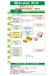4月29日 祝日プログラム(昭和の日) 公開済み: 2026年4月23日更新: 2026年4月23日作成者: スタッフカテゴリー: 新着情報 4月29日(水)は『昭和の日』で祝日の為、営業時間とプログラムに変更があります。 ※ビジター様は別途施設利用料が必要です。 ビジター料金:¥3,300 同伴ビジター:¥2,200 有料プログラム参加のみ:参加費+¥1,100 前の記事 レッスン変更・休講・代行情報 関連記事 2024/09/12 外壁工事のご案内 2025/07/02 大好評!水素水が月会費内で飲み放題! 2024/05/22 【ジャグジー利用再開のご案内】 2024/08/15 【旭店情報】台風7号接近に伴う8月16日(金)の営業について